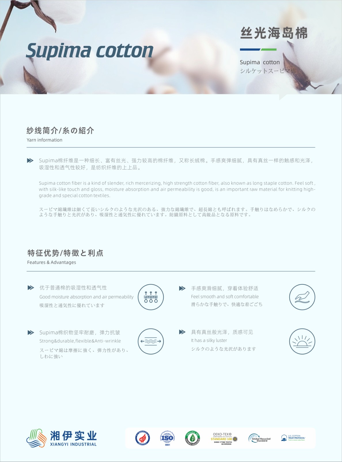 Supima棉纖維是一種細長(cháng)、富有絲光、強力較高的棉纖維,又稱(chēng)長(cháng)絨棉。手感爽彈細膩,具有真絲一樣的觸感和光澤吸濕性和透氣性較好,是紡織纖維的上上品。
