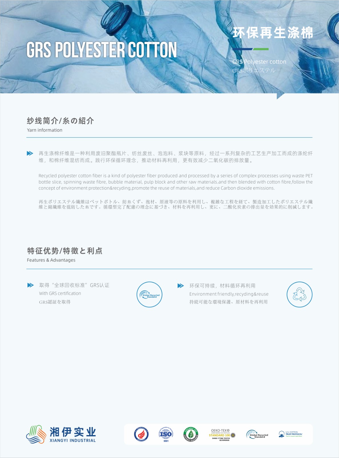 再生滌棉纖維是一種利用廢舊聚酯瓶片、紡絲廢絲、泡泡料、漿塊等原料,經(jīng)過(guò)一系列復雜的工藝生產(chǎn)加工而成的滌綸纖>維,和棉纖維混紡而成。踐行環(huán)保循環(huán)理念,推動(dòng)材料再利用,更有效減少二氧化碳的排放量。